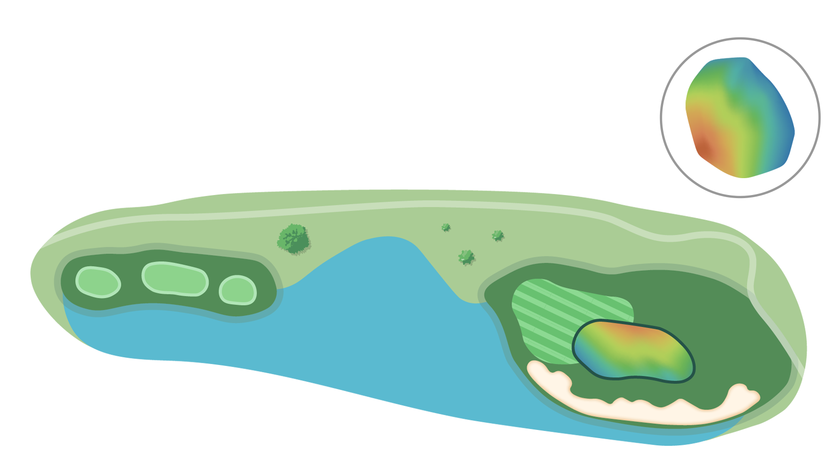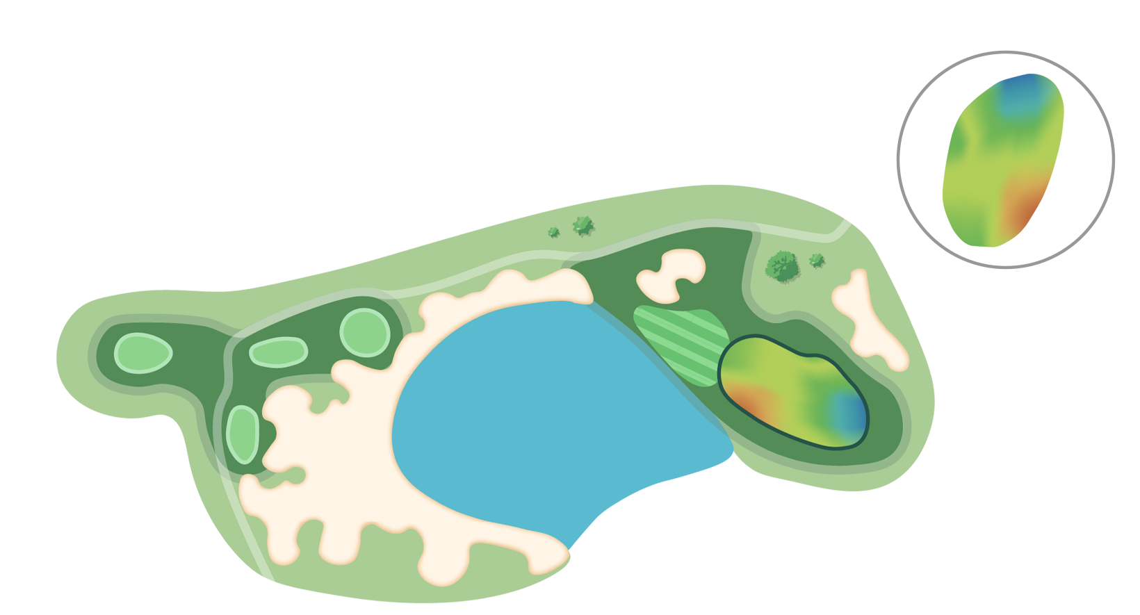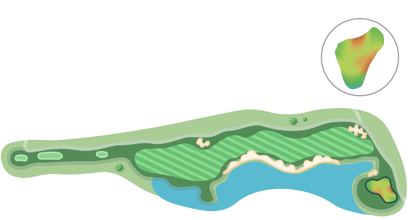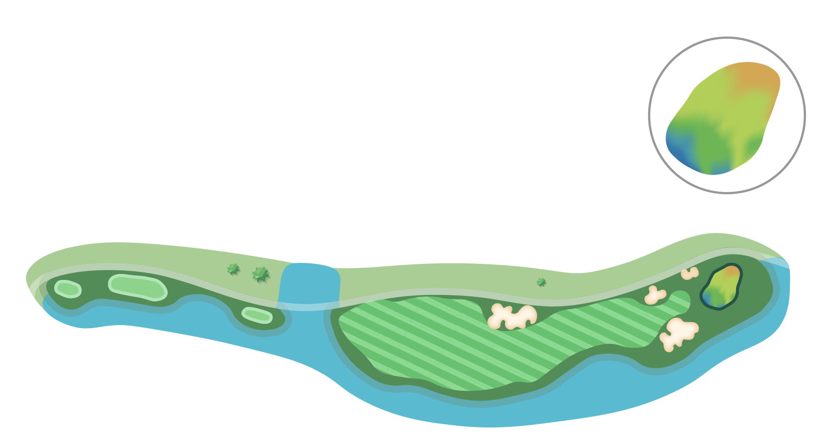 벙커에 둘러싸인 그린은 마치 호수에 떠있는 듯하기에 정확한 거리설정 및 클럽선택이 중요하다.